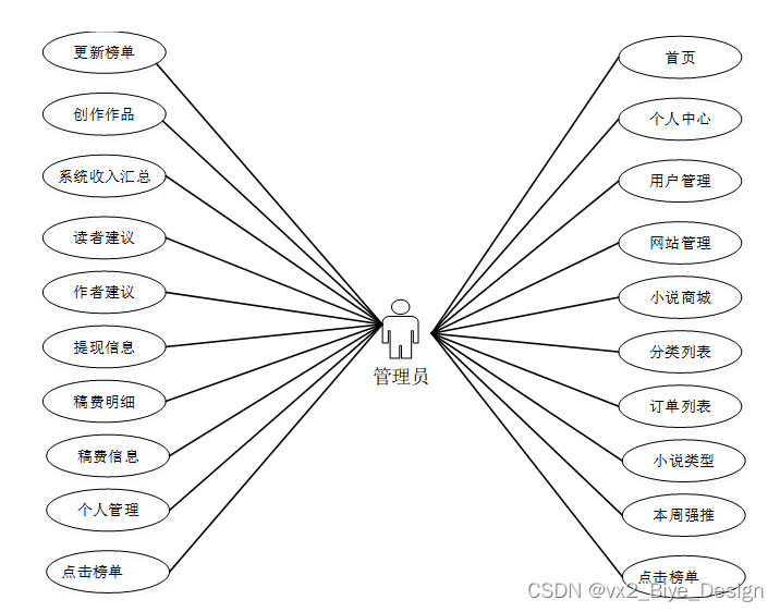 系统中的核心用户是系统管理员,管理员登录后,通过管理员菜单来管理后台系统。主要功能有:首页、网站管理(轮播图、网站公告)人员管理(管理员、读者用户、作者用户)购物管理(小说商城、分类列表、订单列表)模块管理(小说类型、本周强推、点击榜单、更新榜单、创作作品、系统收入汇总、读者建议、作者建议、提现信息、稿费明细、稿费信息)个人管理等功能。管理员用例如图3-7所示。