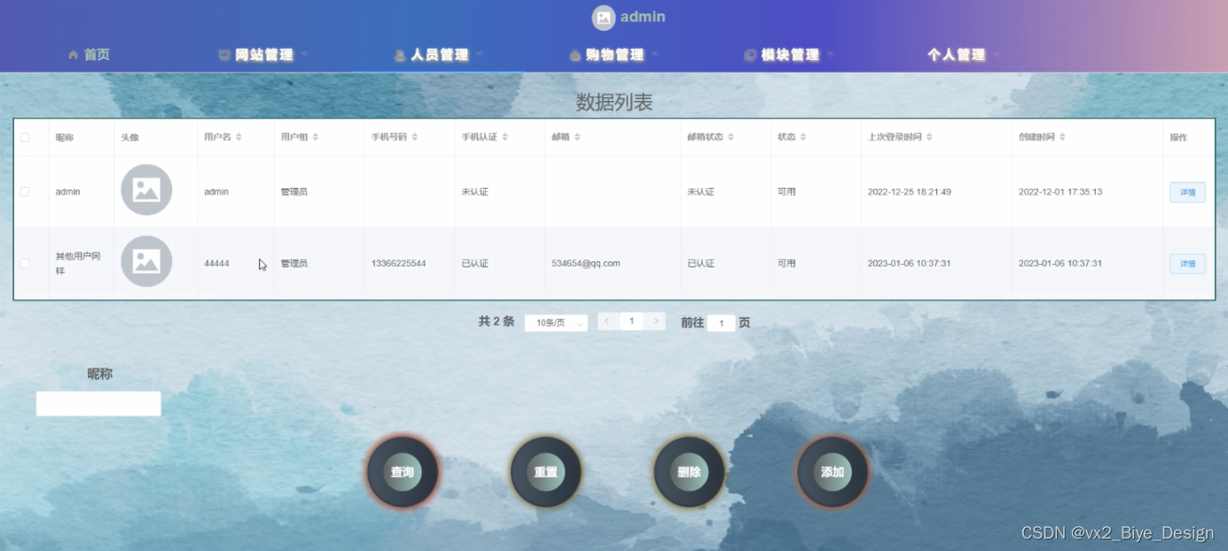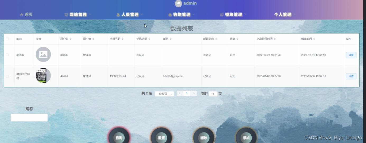 用户管理,在用户管理页面中可以查看索引、用户名、密码、姓名、性别、头像、手机、邮箱等信息,并可根据需要进行修改或删除等操作,如图5-9所示。