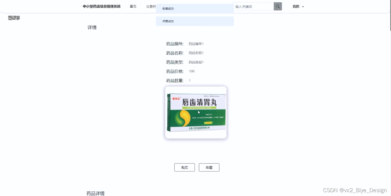 用户可以查看药品信息,在查询到自己想要了解的药品信息的时候,可以进入查看详细的介绍,点击“购买”这一按钮以后会跳转到购买信息填写的界面,根据提示填写好购买的信息;根据提示填写好购买的信息点击“提交”以后购买就完成了,在药品信息详情这个界面,同时支持用户对喜欢的药品信息进行收藏、点赞的功能,药品详情展示页面如图4-4所示。