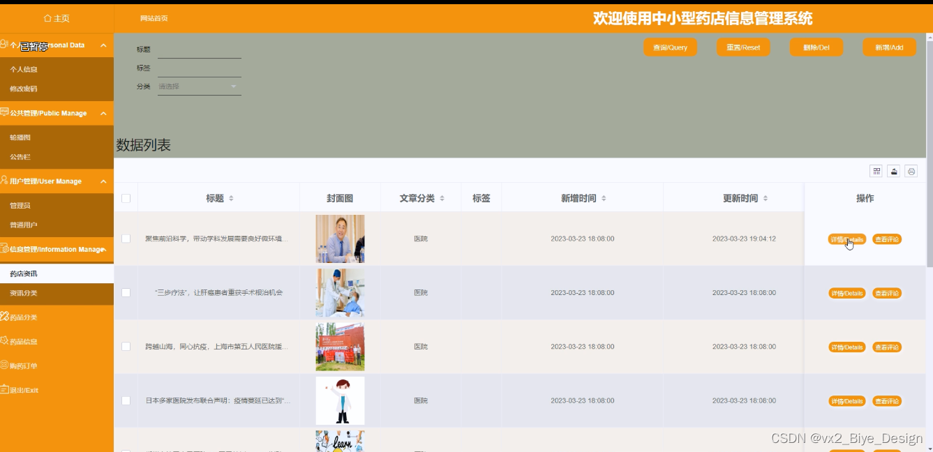 (3)信息管理:管理员可以对中小型药店信息管理系统前台展示的药店资讯以及资讯分类进行管控。