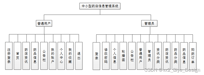 中小型药店信息管理系统整体的功能模块包括管理员+普通用户两个模块,其总体设计模块图如图3-1所示。