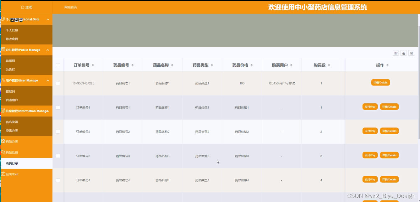 (5)购药订单:管理员点击“购药订单”会显示出所有的购药订单信息,支持输入订单编号或者药品编号对购药订单信息进行查询,如果想要添加新的购药订单信息,点击“添加”按钮,输入相关信息,点击“提交”按钮就可以添加了,同时可以选择某一条购药订单信息,点击“删除”进行删除,也可以点击后面的“支付”按钮对购药订单的支付信息进行设置;
