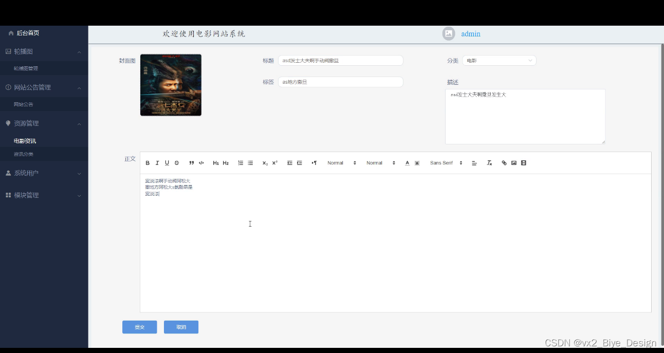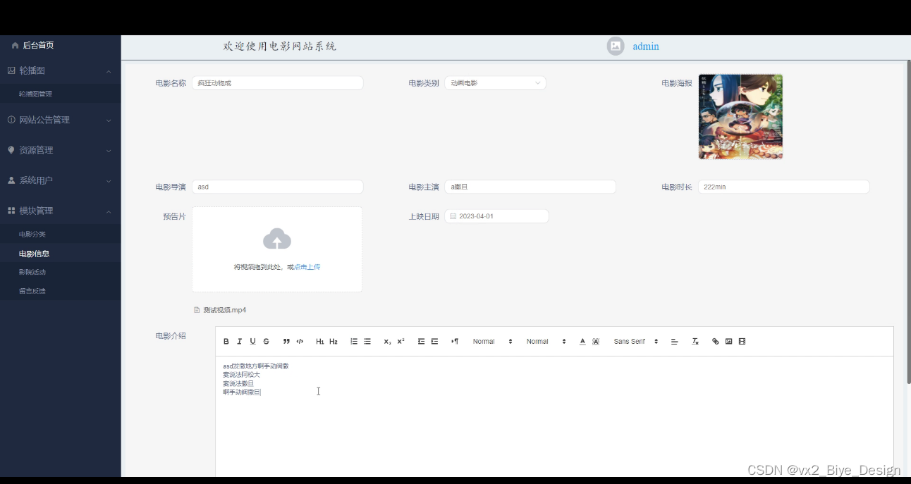 管理员登录电影网站系统,管理员后台功能为:后台首页,轮播图管理,网站公告管理,资源管理(电影资讯,资讯分类),系统用户(管理员,注册用户),模块管理(电影分类,电影信息,影院活动,留言反馈)等功能,如下图所示: