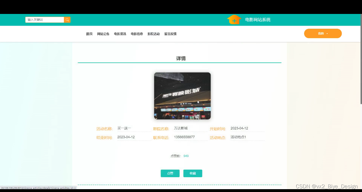 影院活动, 在此界面可通过关键字,下拉搜索等方式查看影院活动信息,可在详情页面进行点赞,收藏,评论等操作,如下图所示。