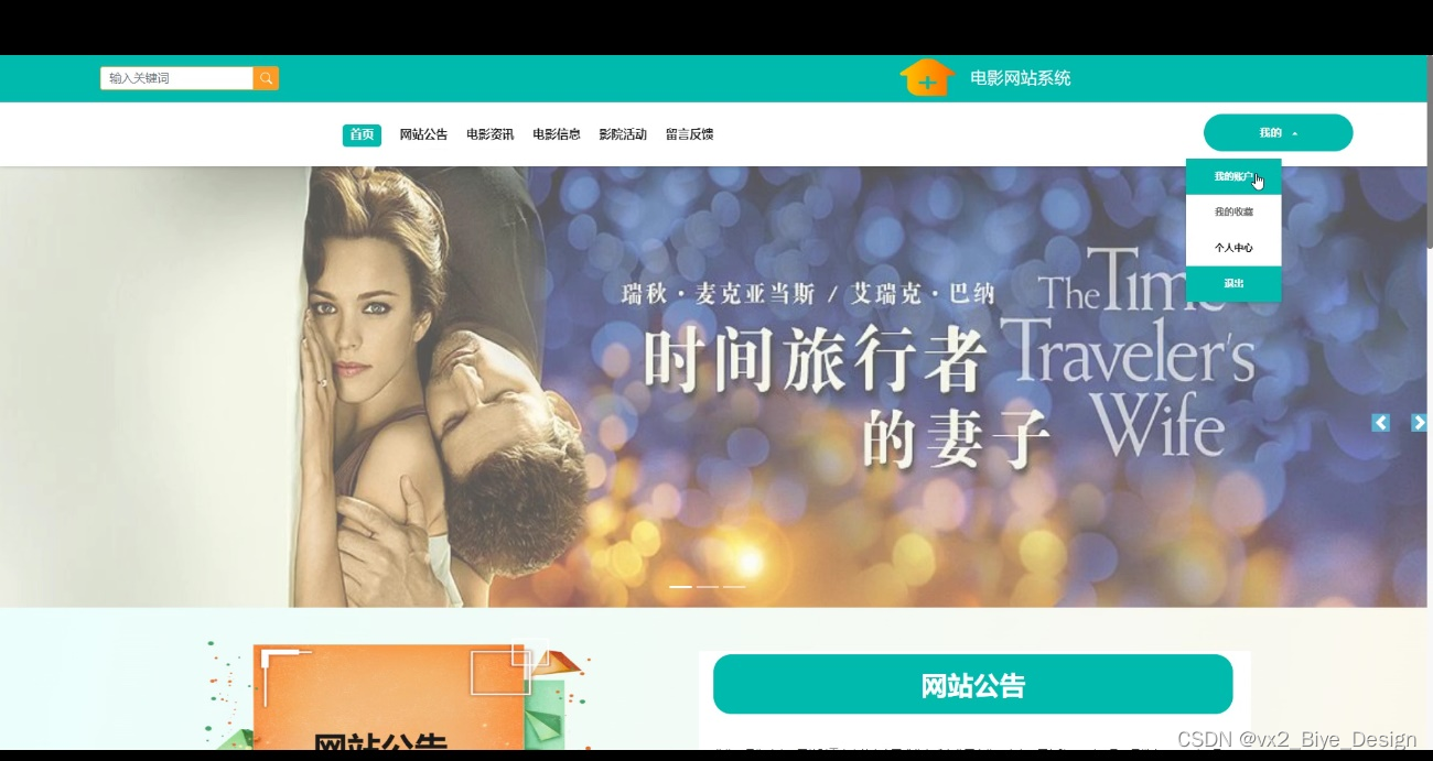 注册用户登录电影网站系统,功能有首页,网站公告,电影资讯,电影信息,影院活动,留言反馈,我的(我的账户,我的收藏,个人中心)等,如下图所示: