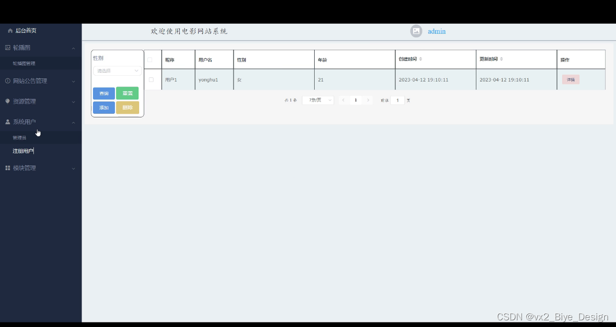3、功能的完善性:拥有首页,轮播图管理,网站公告管理,资源管理(电影资讯,资讯分类),系统用户(管理员,注册用户),模块管理(电影分类,电影信息,影院活动,留言反馈)等模块的修改维护操作。