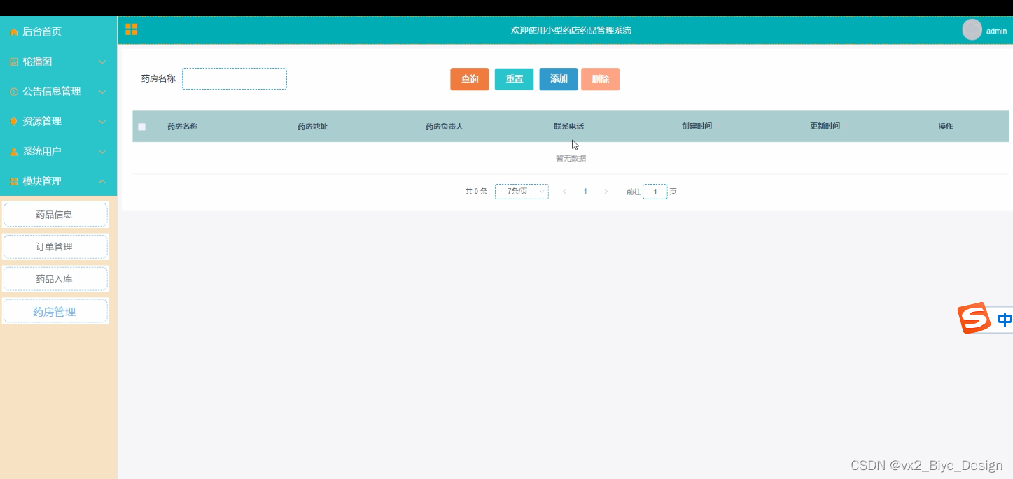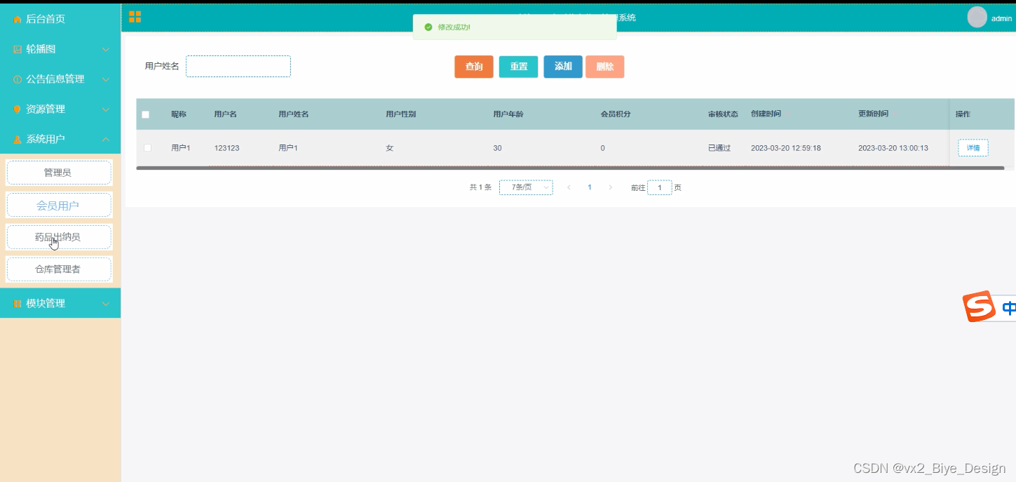 药店药品管理系统在系统的手机上可以运行,主要实现了管理员后端;管理员、首页、轮播图、公告信息、资源管理(新闻列表、新闻分类列表)系统用户(管理员、会员用户、药品出纳员、仓库管理者)模块管理(药品信息、订单管理、药品入库、药房管理)等主要功能模块的操作和管理。