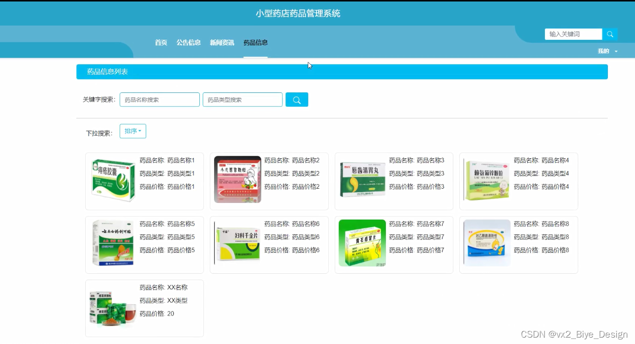 系统前台药品信息列表,药品信息列表可查看药品名称、药品类型、药品价格等信息,如图5-9所示: