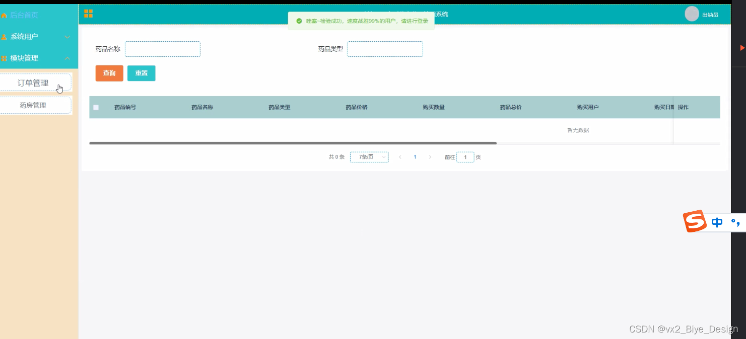 订单管理,在订单管理页面可以查看订单号、药品名称、药品编号、药品类型、价格、购买数量、合计、出售进度等信息进行,如图5-11所示。