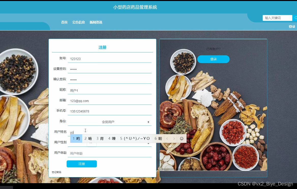 在系统首页注册,用户在前台页面注册信息:账号、密码、昵称、邮箱、手机、身份、头像、用户姓名、用户性别等内容,如图5-9所示:
