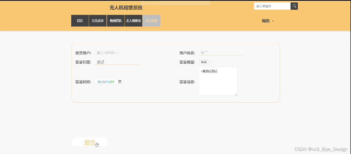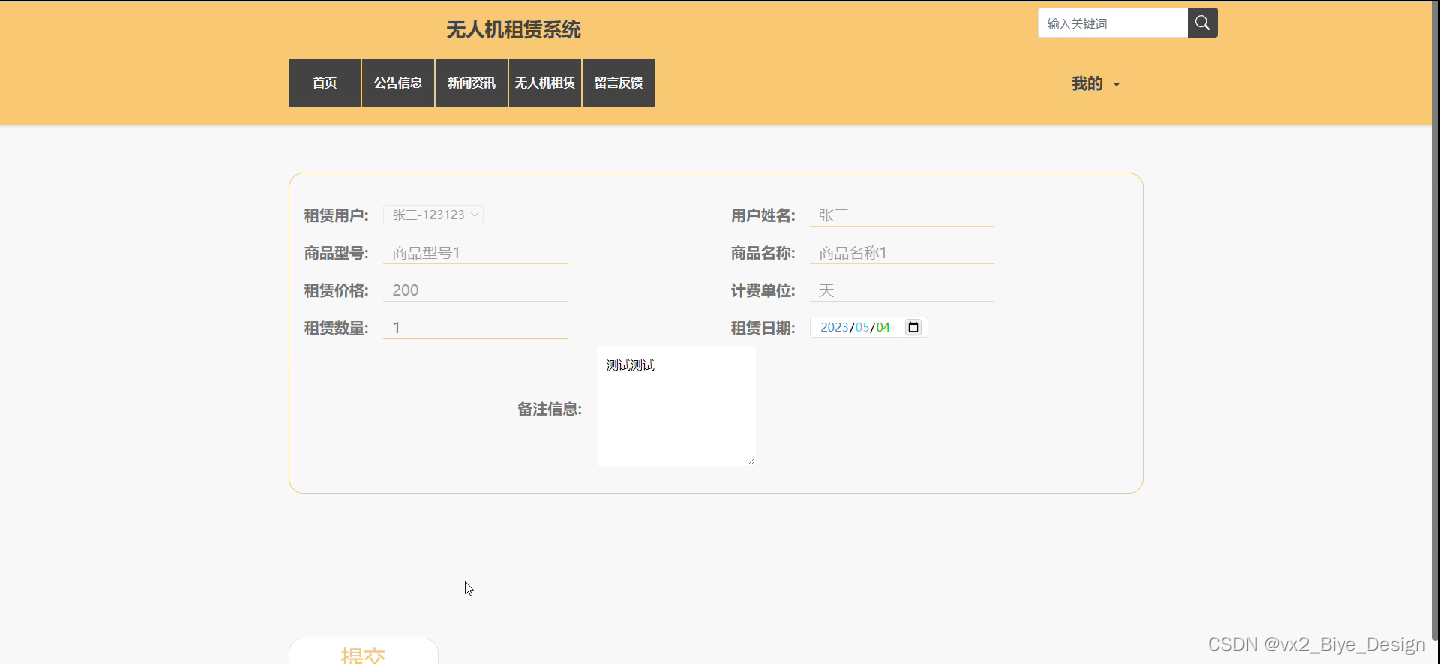 | 点击搜索无人机信息,输入存在的无人机租赁信息名 | 查找出无人机信息 | 与预期结果一致 |