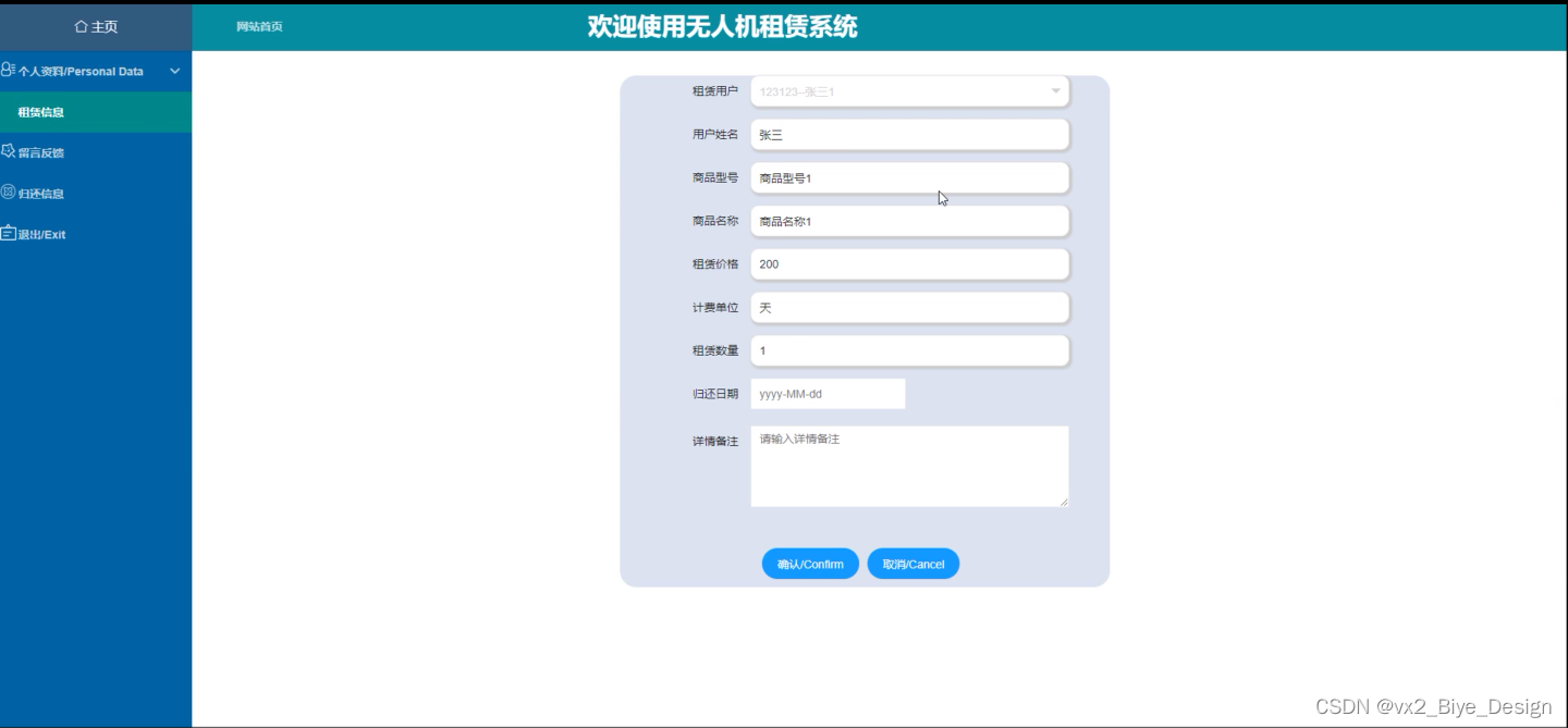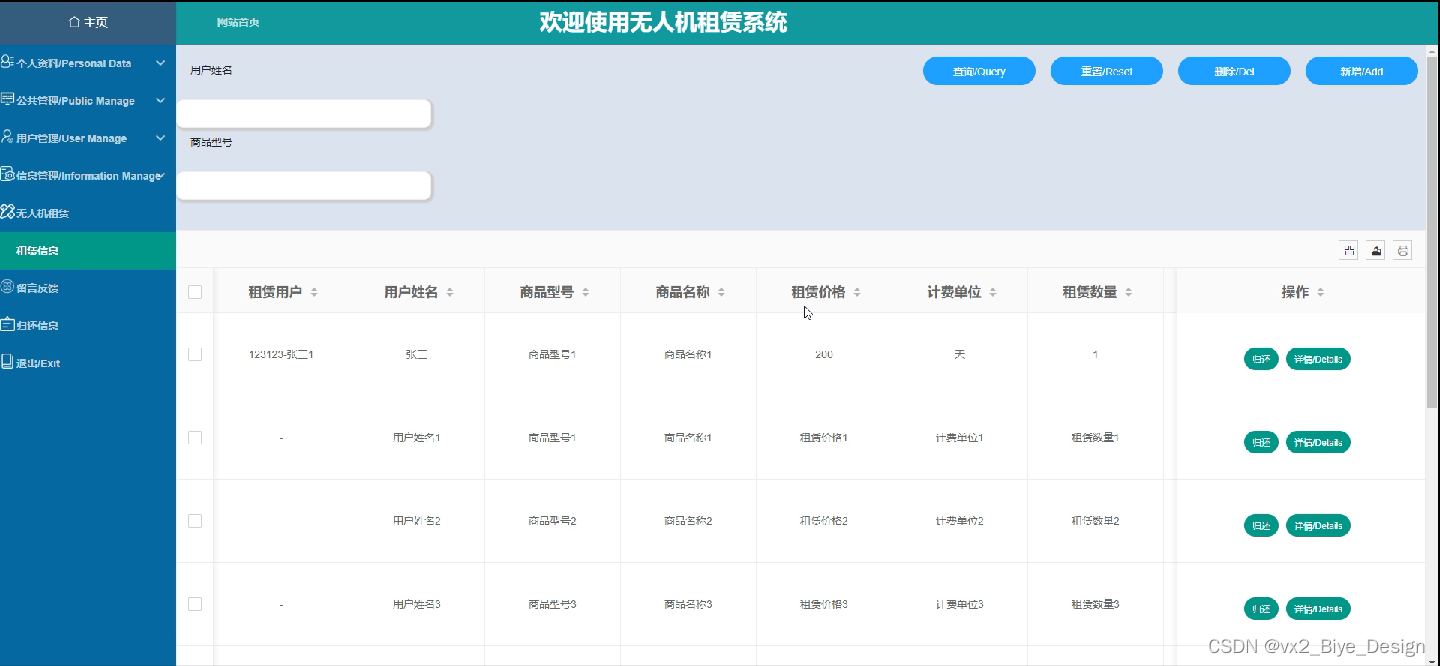 租赁信息:存储用户的无人机租赁信息。包括无人机租赁信息的租赁用户、用户姓名、商品型号、商品名称、租赁价格、计费单位、租赁数量、租赁日期等数据项。