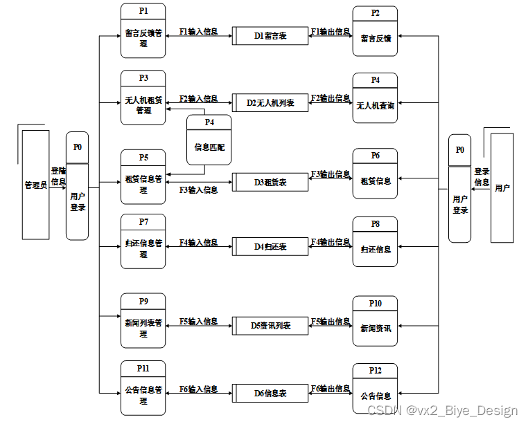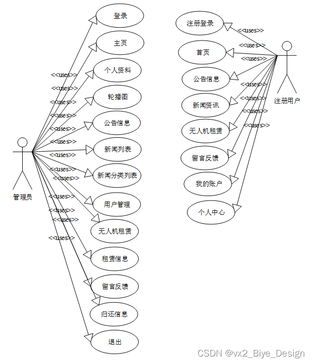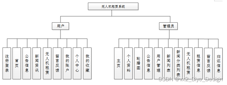 无人机租赁系统的功能主要分为前台用户根据自己的需求进行注册登录,浏览无人机信息并对选中的无人机进行租赁操作。后台系统管理员因职责的不同,分为普通管理员和超级管理员,普通管理员主要对租赁单进行处理,处理用户留言反馈,而超级管理员主要对注册用户,租赁信息数据,无人机详细信息,归还详细信息,留言反馈进行处理。