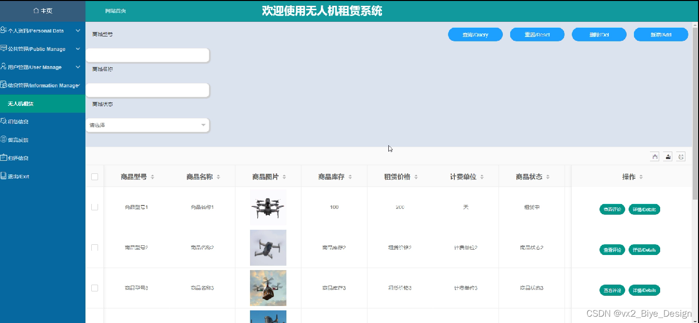 无人机租赁:存放给无人机信息的内容,包括商品型号、名称、图片、库存、状态、毛重、租赁价格、计费单位、最大信号有效距离、视频拍摄能力、感知系统类型、最大飞行时间、电池容量等数据项。