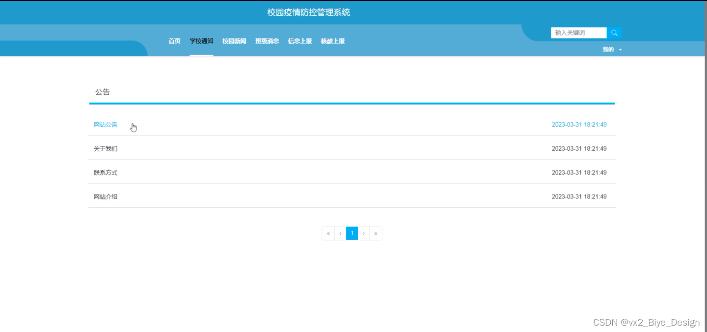 (3)学校通知:在首页导航栏上我们会看到“学校通知”这一菜单,我们点击进入进去以后,会看到所有管理员在后台发布的学校通知信息;