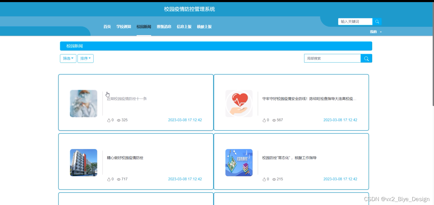 当用户点击校园疫情防控管理系统中导航栏上的“校园新闻”后将会进入到该“新闻”列表的界面,然后选择想要看的校园新闻,点击进入到详细界面,在详细界面可以收藏、评论、点赞等操作,校园新闻界面如下图4-5所示。