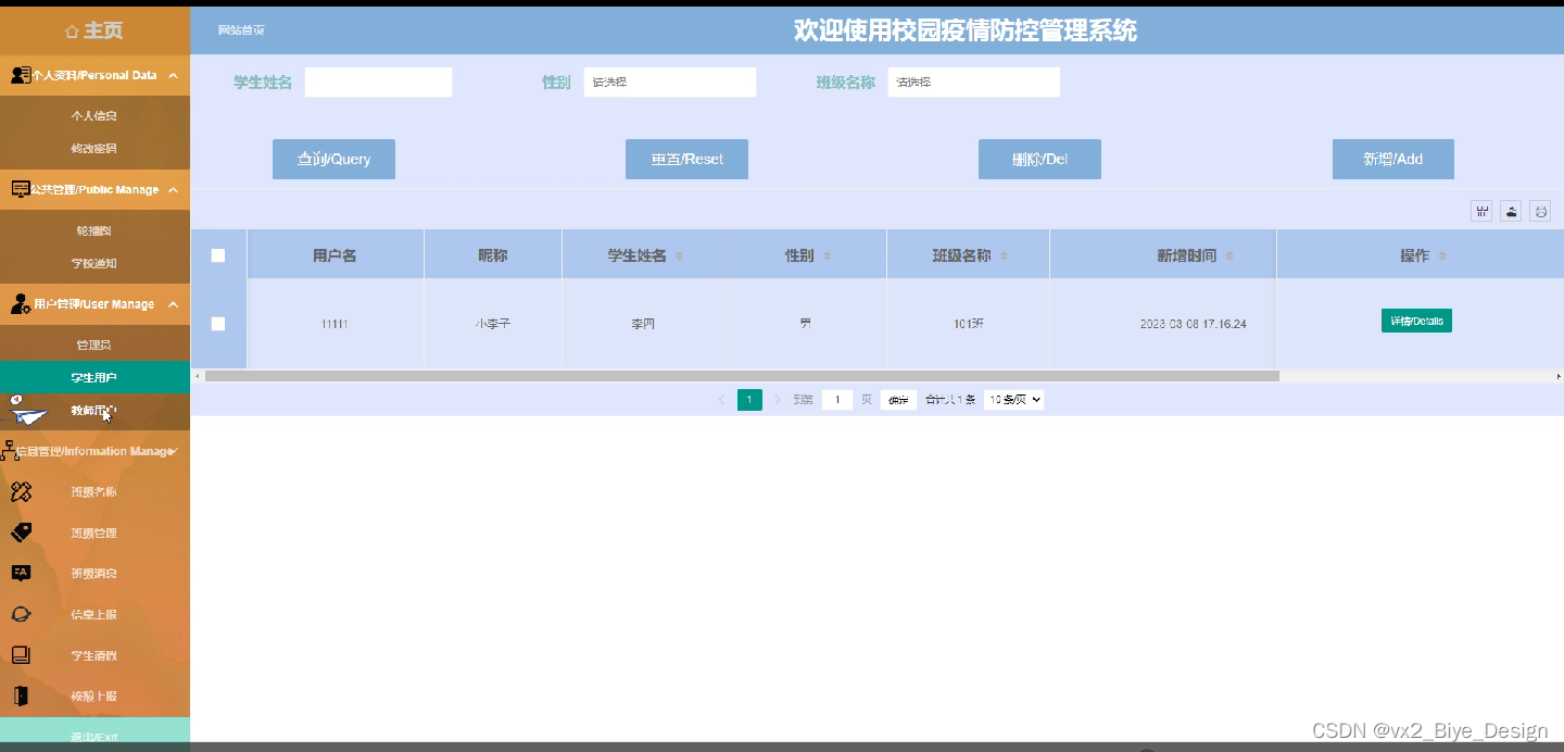 This design mainly realizes the campus epidemic prevention and control management system integrating the advantages of humanization, efficiency and convenience, and completes the system user (administrator, student user, teacher user), public management (broadcast map, school notice), information management (news list, news classification), personal data, class name, class management, class information, information reporting, nucleic acid reporting, student leave and other functional modules. The system communicates with the server through the browser to realize data interaction and change. The system improves work efficiency and reduces errors and omissions in data storage through scientific management and convenient services. The campus epidemic prevention and control management system uses Java language, adopts the ssm technology based on MVVM mode for development, and uses MyEclipse 2017 CI 10 compiler for compilation. The data mainly uses Microsoft's MySQL relational database as the data storage medium, and cooperates with HTML+CSS technology to complete the system development.