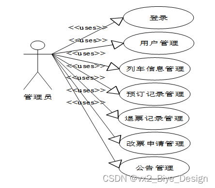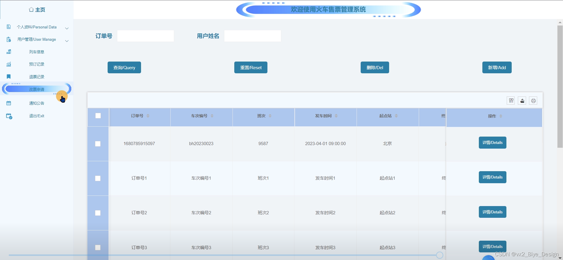 预订记录/改票申请/退票记录管理模块:火车车次管理分为预订添加、改票申请和退票操作,预订、改签、退票由用户进行提交操作;由管理员进行审核处理。