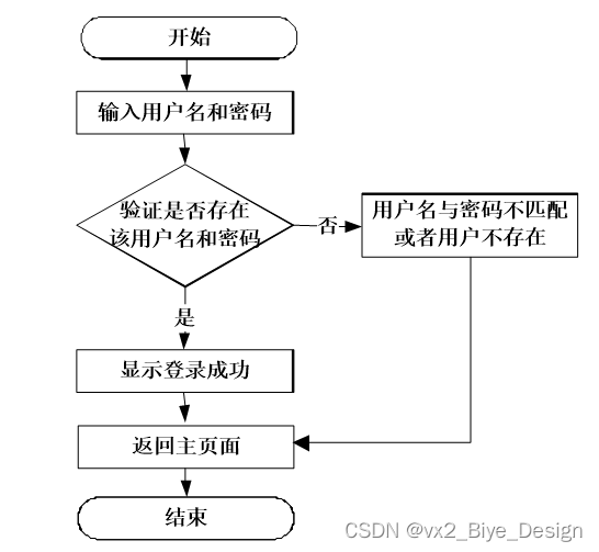 用户登录流程:用户只有输入正确的用户名和密码才会成功进入系统,用户输入用户名密码后点击登录按钮,系统会进行校验该用户名是否存在,如果用户名与密码不匹配或者用户名不存在,则返回主界面。
