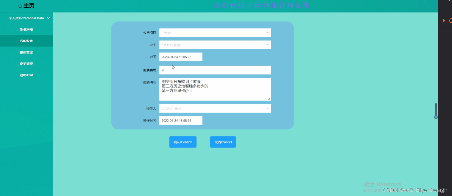当访业主击小区物业管理系统中导航栏上的“我的收费”后将会进入到该收费信息提交的界面,系统会自动生成收费项目、业主、时间等信息,业主只需要输入缴费费用、缴费明细就可以了,收费界面如下图5.4所示。
