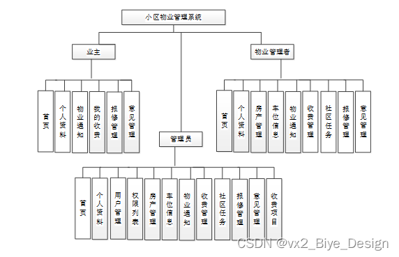 系统的整体架构确定以后,再来看小区物业管理系统的主要功能模块图。整体的功能模块包括管理员+业主+物业管理者三个模块,实现的模块主要有首页、个人资料、用户管理(管理员、业主用户、物业管理者)权限管理(权限列表)房产管理、车位信息、物业通知、收费管理、社区任务、报修管理、意见管理、收费项目等。