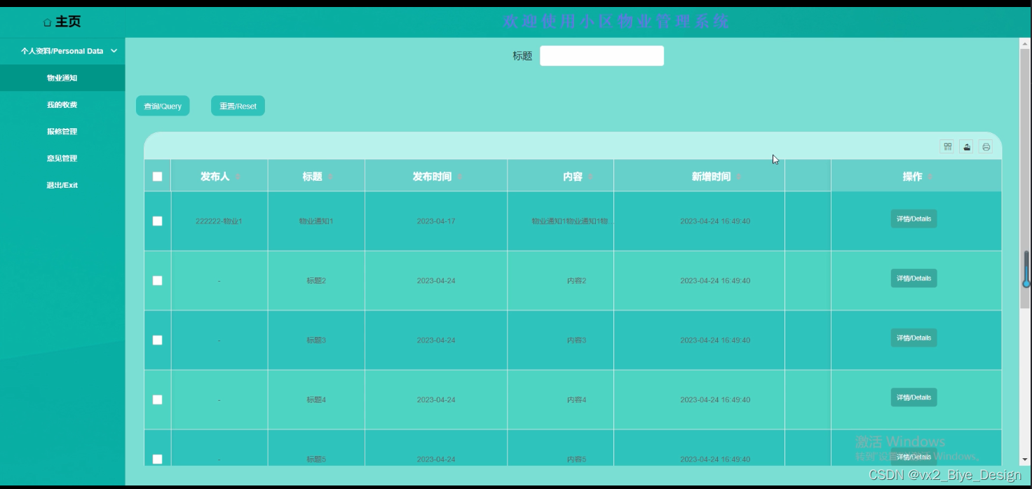 小区物业管理系统的详细设计与实现主要是根据前面的小区物业管理系统的需求分析和小区物业管理系统的总体设计来设计页面并实现业务逻辑。主要从小区物业管理系统界面实现、业务逻辑实现这两部分进行介绍。