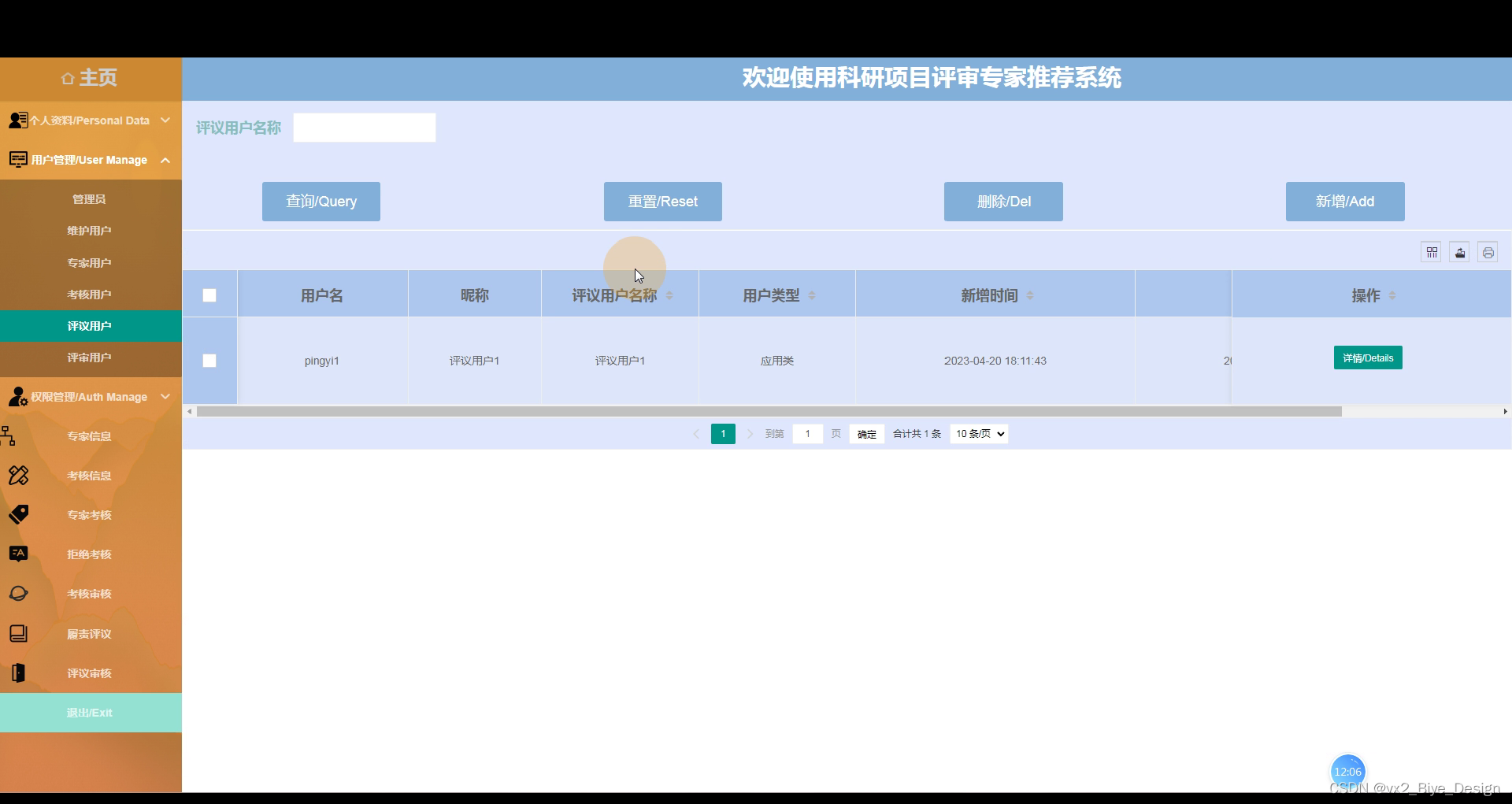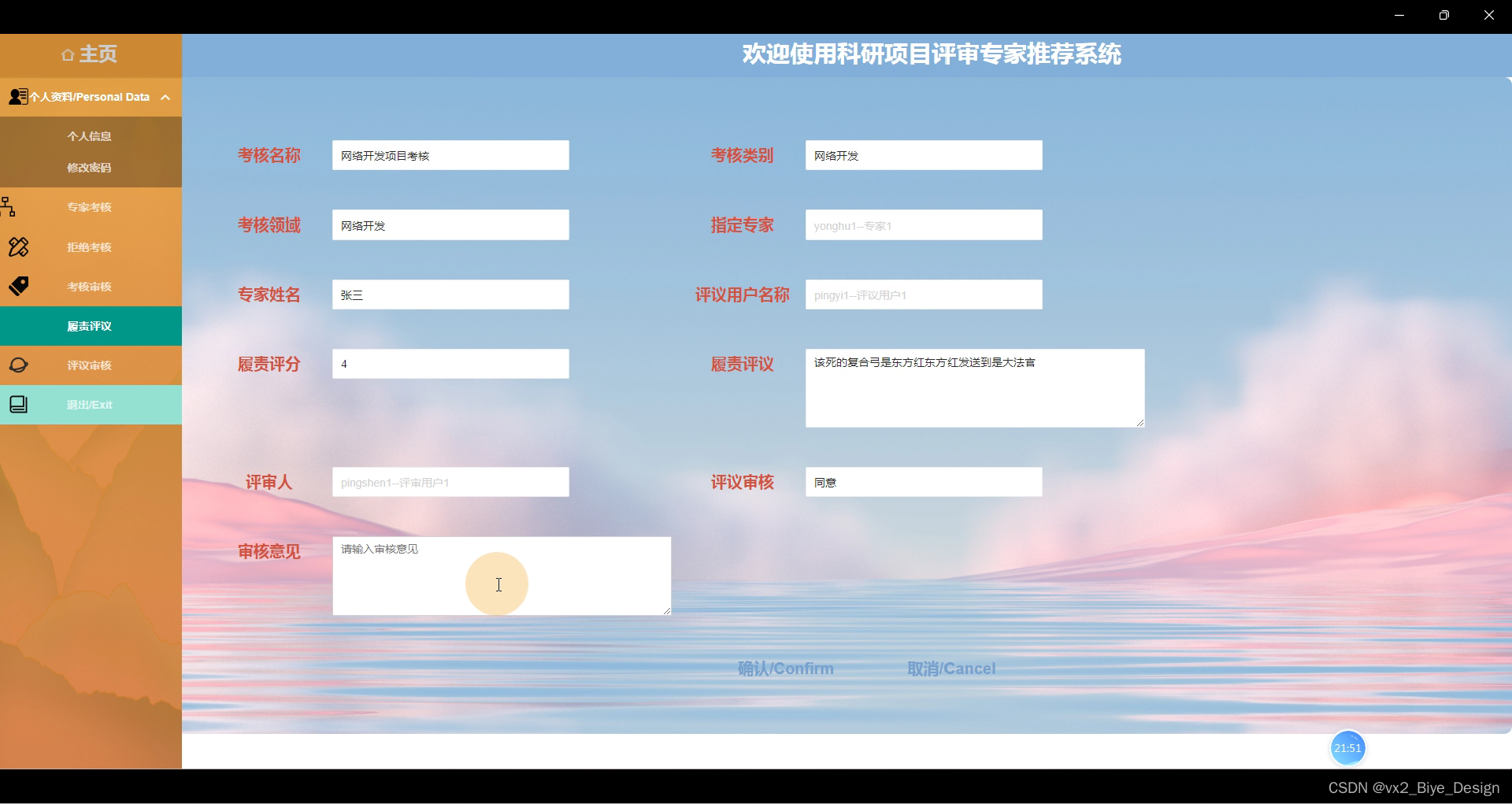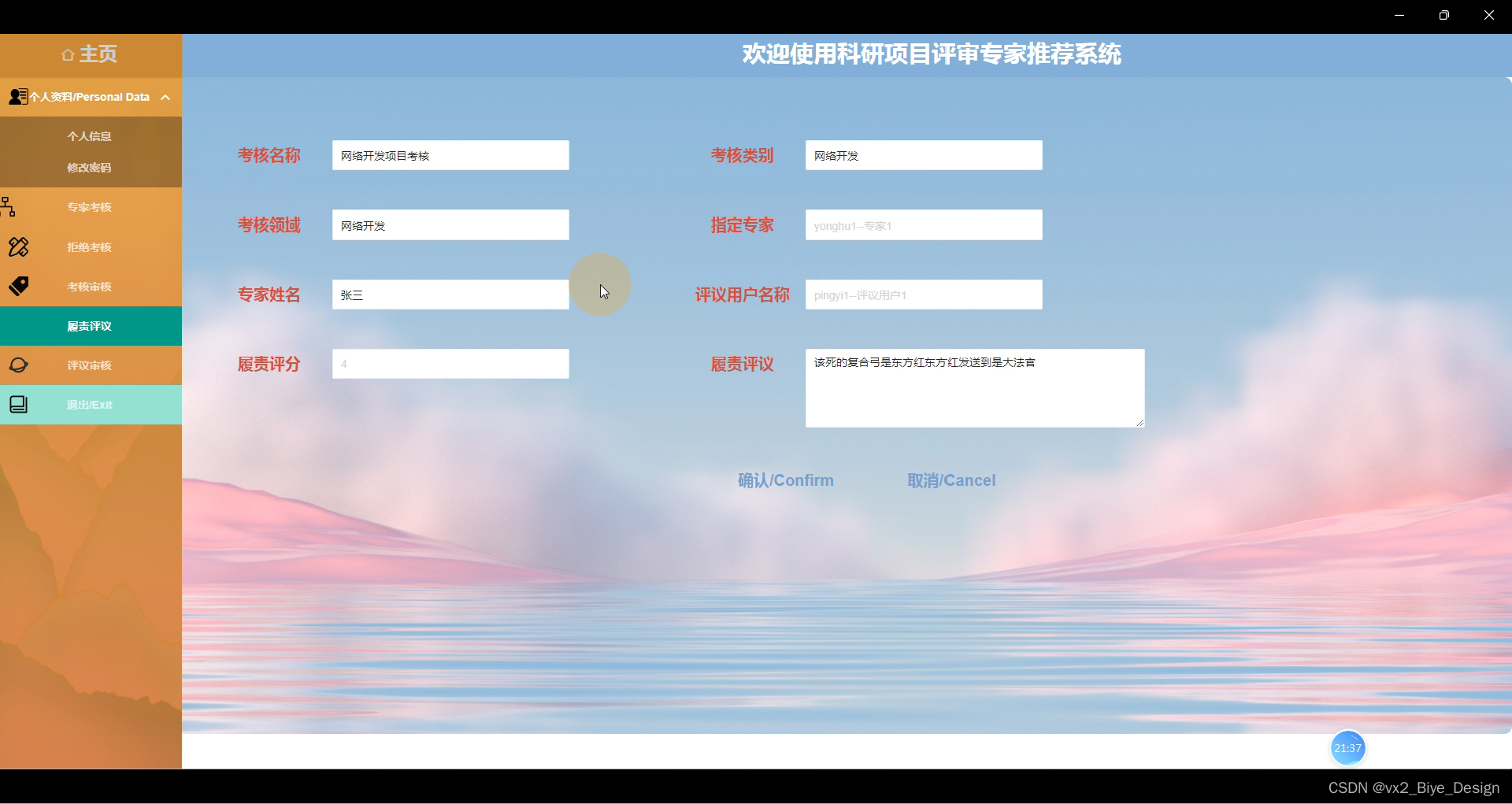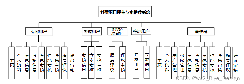 科研项目评审专家推荐系统的使用者分为管理员,维护用户,专家用户,考核用户,评议用户,评审用户等。实现功能包括主页,个人资料,用户管理,权限管理,专家信息,考核信息,专家考核,拒绝考核,考核审核,履责评议,评议审核等功能。