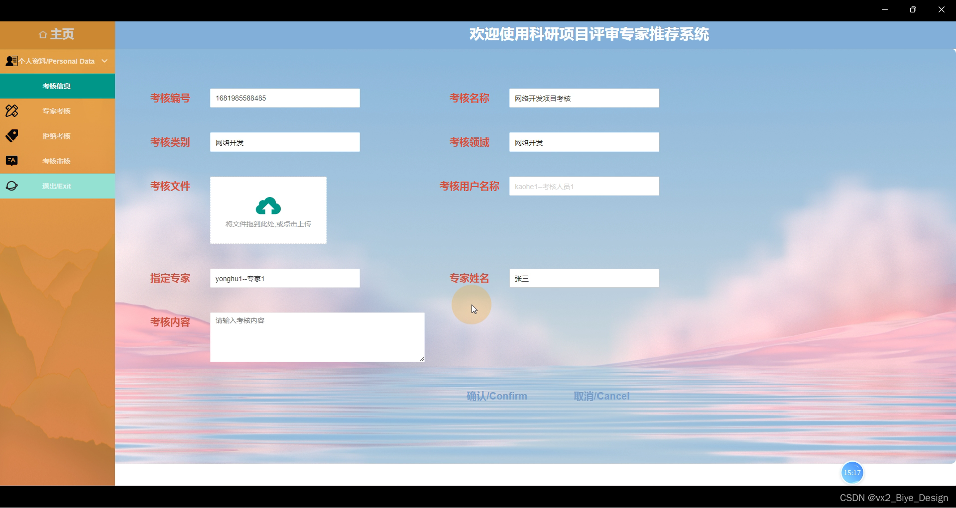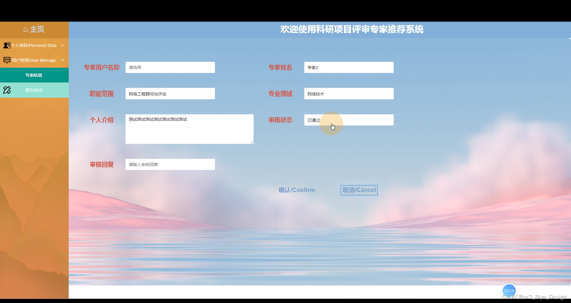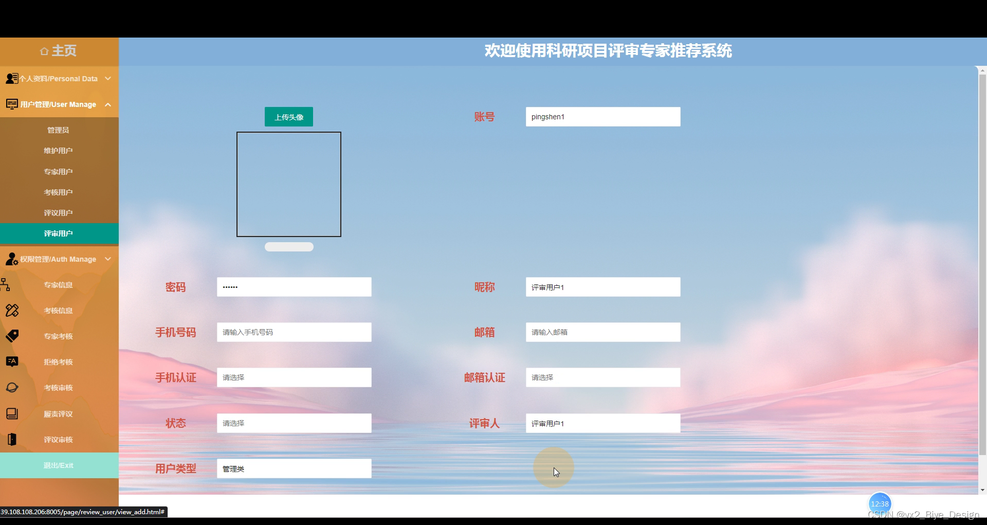 科研项目评审专家推荐系统的使用者分为管理员,维护用户,专家用户,考核用户,评议用户,评审用户等。实现功能包括主页,个人资料,用户管理,权限管理,专家信息,考核信息,专家考核,拒绝考核,考核审核,履责评议,评议审核等功能。