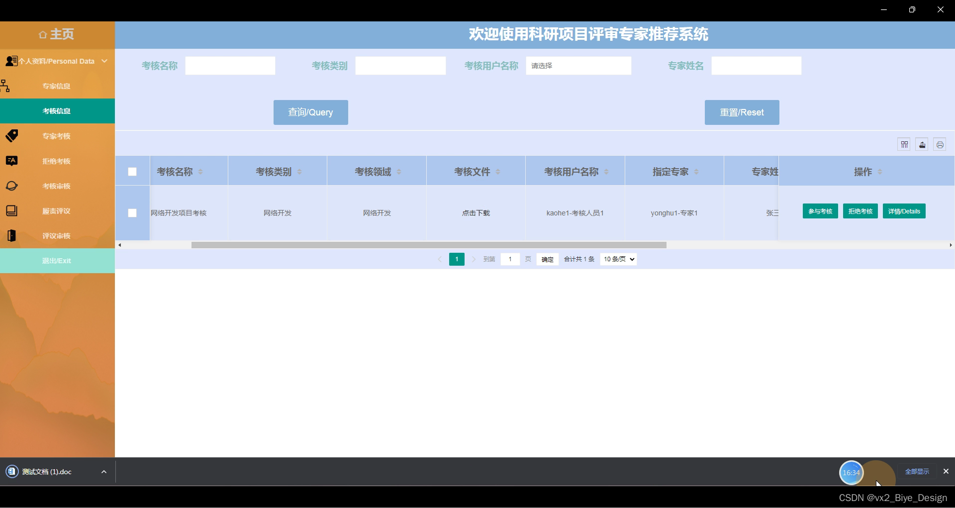 专家用户登陆系统后可查看考核用户分派的考核任务信息,可以选择参与考核,拒绝等操作。如下图所示。