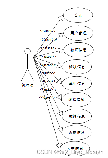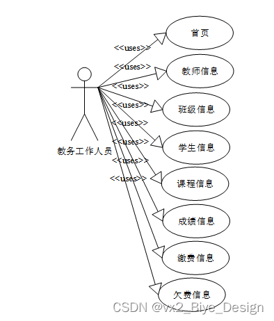 系统设计的目的是分析系统包括的所有功能结构,为开发人员设计开发和实现系统做好准备工作。经过前期的需求调查、分析和整理之后,确定的总体需求主要包括多个模块,分别是:系统用户设置、学生管理、教师管理、课程管理、学生选课管理、缴费信息管理。系统整体角色分为两个部分,一是教务工作人员、最后是管理员。权限分布也是很明显,教务工作人员用户是在除去浏览信息之外还具有查询和管理教师信息、班级信息、学生信息、课程信息、成绩信息、缴费信息、欠费信息等权限;管理员是最高权限拥有者。