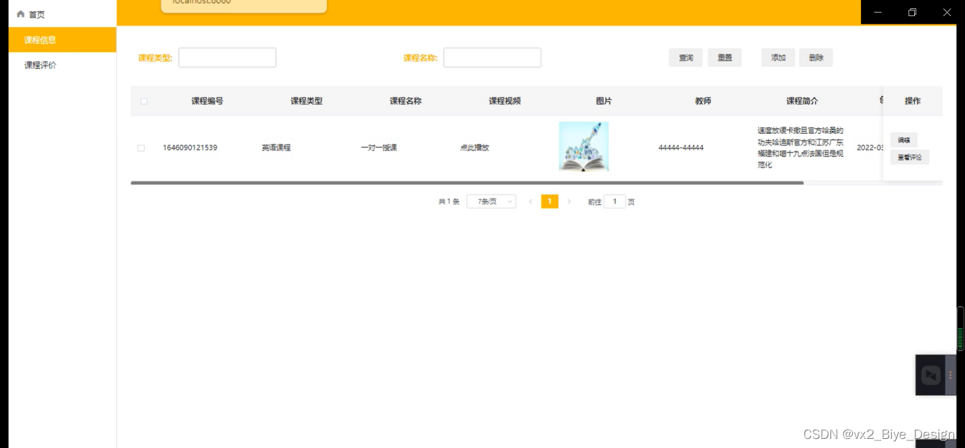 课程信息管理,在课程管理页面图中可以添加课程专业:课程类型、课程编号、课程名称、上课时间、教师姓名、课程简介等内容,还可在课程管理查询页面对已有的课程进行评价,编辑删除详情等操作 如图5-6所示: