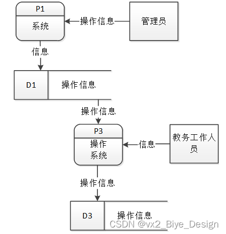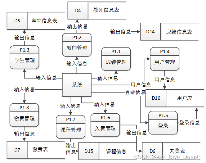 二层数据流程是对一层数据流层图中填写登录信息、用户功能的细化。即:填写登录信息细化为填制信息、后台审核,用户功能细化为教师信息、班级信息、学生信息、课程信息、成绩信息、缴费信息、欠费信息、个人管理等操作。