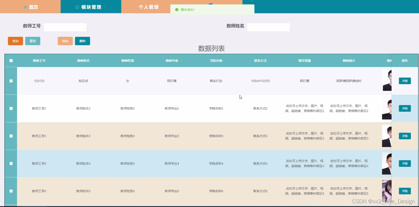 教师管理,在教师管理页面中对教师进行添加:教师工号、教师姓名、教师性别、教师专业、学院名称、联系方式、教学班级、教师简介等内容,还可在教师查询页面对已有的教师信息进行编辑删除详情等操作,如图5-5所示:
