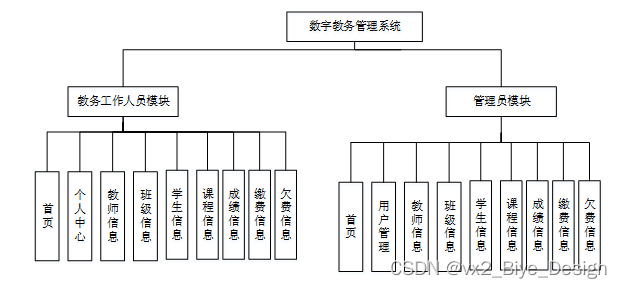 数字教务管理系统在对需求做解析后,整个系统主要分为管理员和教务工作人员,每个模块下的分支功能不一样。教务工作人员模块包括:首页、模块管理(教师信息、班级信息、学生信息、课程信息、成绩信息、缴费信息、欠费信息)个人管理;管理员模块包括:首页、人员管理(管理员、教务工作人员)模块管理(教师信息、班级信息、学生信息、课程信息、成绩信息、缴费信息、欠费信息)等模块。