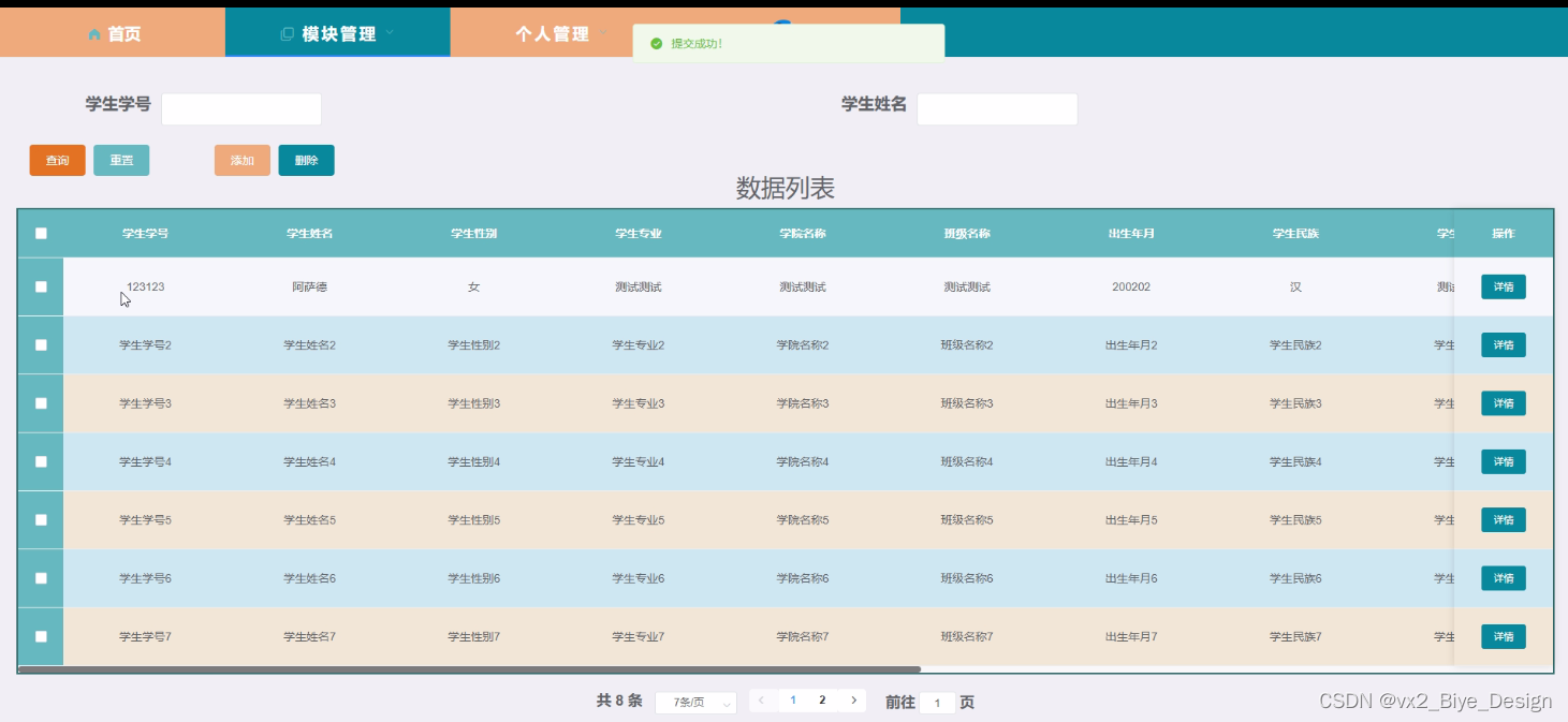 学生信息管理,在学生管理界面图可添加学生信息内容:学生学号、学生姓名、学生性别、学生专业、学院名称、班级名称、出生年月、学生民族等信息,并可在学生管理查询页面进行编辑删除详情等操作,如图5-4