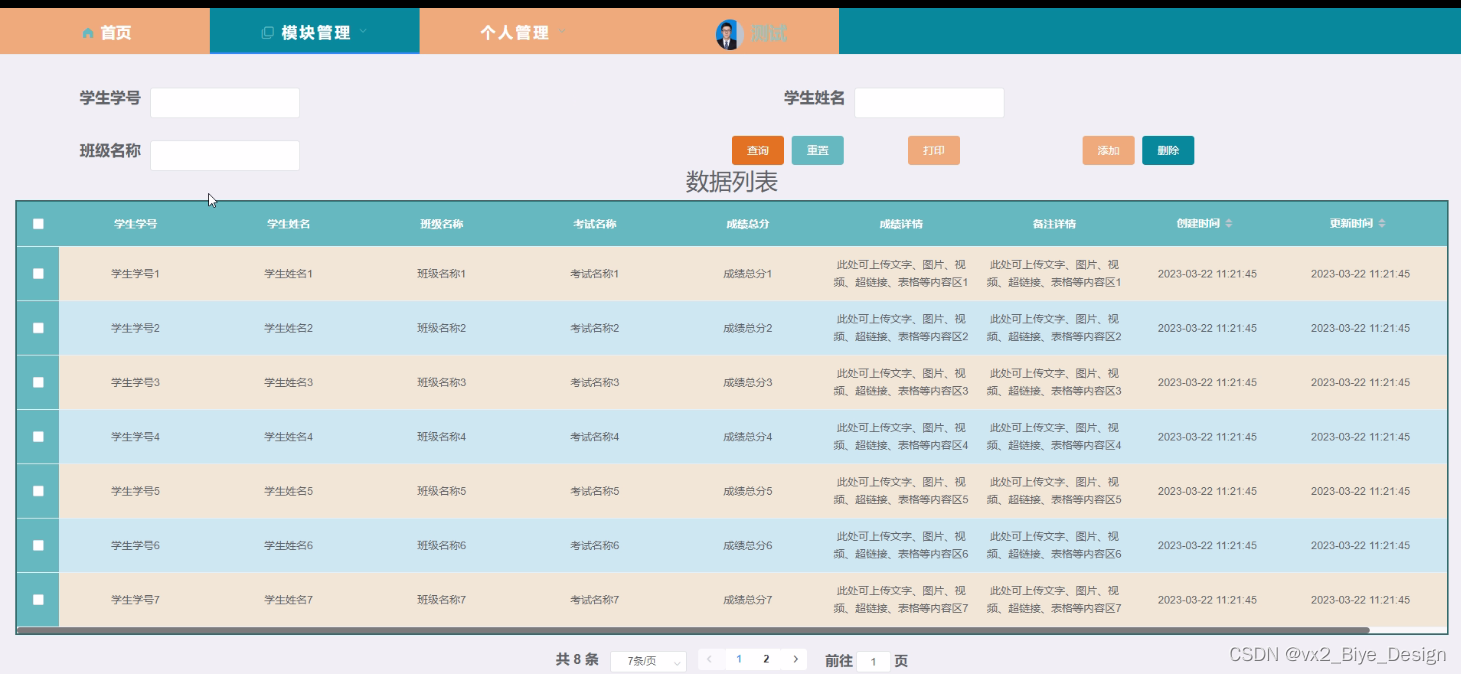 成绩信息管理,在成绩信息管理可查询、学生学号、学生姓名、班级名称、考试名称、成绩总分、成绩详情等内容,还可在该页面进行编辑删除详细等操作,如图5-7