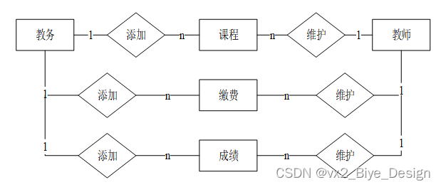 对于一个要开发的系统来说,E-R图可以让别人能更快更轻松的了解此系统的事务及它们之间的关系。根据系统分析阶段所得出的结论确定了在数字教务管理系统中存在着多个实体分别是用教师、管理员、课程、成绩、缴费。
