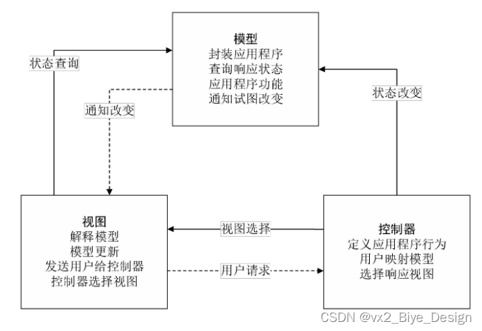 MVVM 就是将其中的View 的状态和行为抽象化,让我们将视图 UI 和业务逻辑分开。当然这些事 ViewModel 已经帮我们做了,它可以取出 Model 的数据同时帮忙处理 View 中由于需要展示内容而涉及的业务逻辑。它强制性的把应用程序的输入、输出和处理全部分开,将其分为三个核心部分,这三个部分分别有不同的功能。