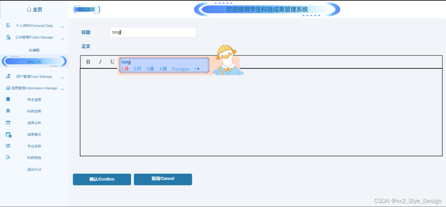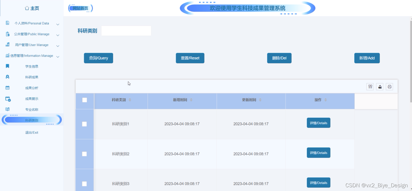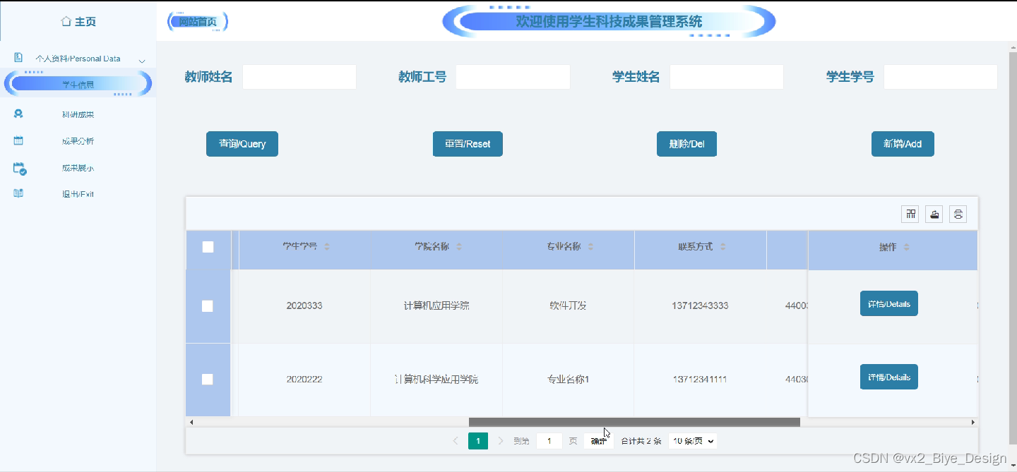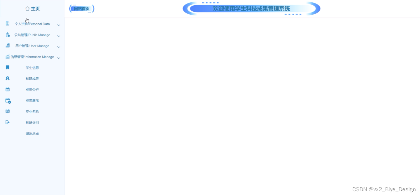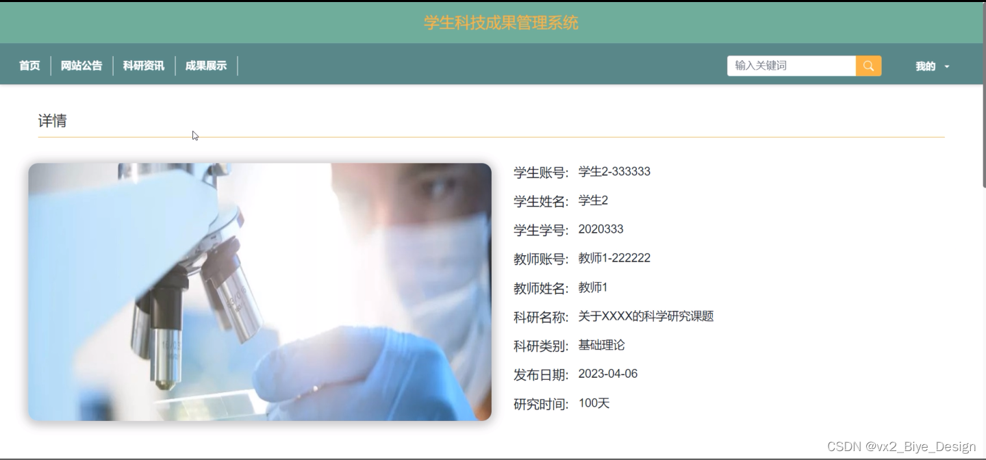 This design mainly implements a student scientific and technological achievements management system that combines the advantages of humanization, efficiency, and convenience. It completes functional modules such as homepage, personal information, user management (administrators, student users, teacher users), public management (broadcast images, website announcements), information management (scientific research information, information classification), student information, scientific research achievements, results analysis, results display, professional names, scientific research categories, etc, The system communicates with the server through a browser to achieve data interaction and changes. You only need to use a computer and move your fingers to operate the system, achieving data communication management. The entire system design process fully considers issues such as data security, stability, and reliability, and the operation process is simple. This system improves work efficiency and reduces errors and omissions in data storage through scientific management and convenient services.