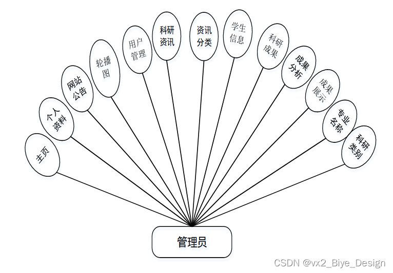(1)管理员模块:系统中的核心用户是系统管理员,管理员登录后,通过管理员菜单来管理后台系统。主要功能有:主页、个人资料(个人信息、修改密码)公共管理(轮播图、网站公告)用户管理(管理员、学生用户、教师用户)信息管理(科研资讯、资讯分类)、学生信息、科研成果、成果分析、成果展示、专业名称、科研类别等功能模块。管理员用例图如图3-1所示。