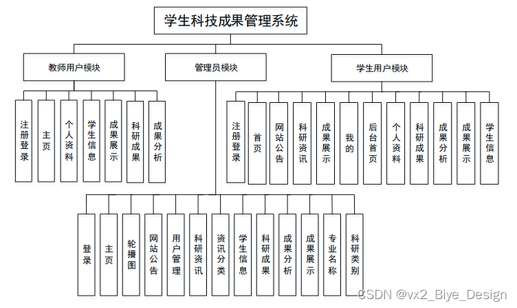 本学生科技成果管理系统主要包括两大功能模块,即管理员功能模块和用户模块。