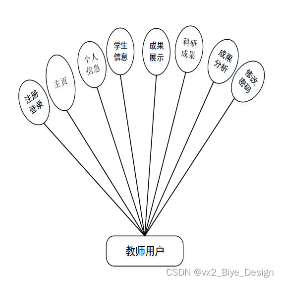 (3)教师用户:主页、个人资料(个人信息、修改密码)学生信息、科研成果、成果分析、成果展示等功能模块。教师用户用例图如图3-3所示。