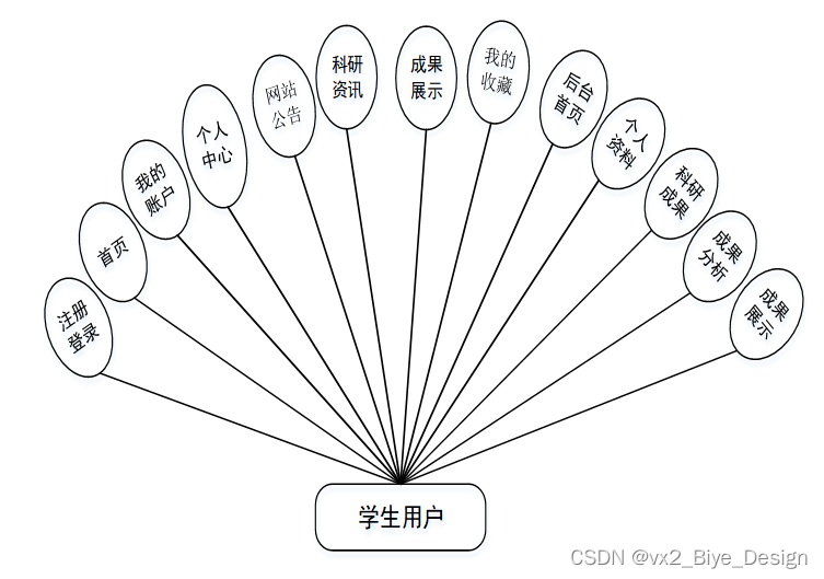 (2)学生用户:首页、网站公告、科研资讯、成果展示、我的(我的账户、我的收藏、个人中心)后台首页:个人资料(个人信息、修改资料)科研成果、成果分析、成果展示等功能模块。学生用户用例图如图3-2所示。