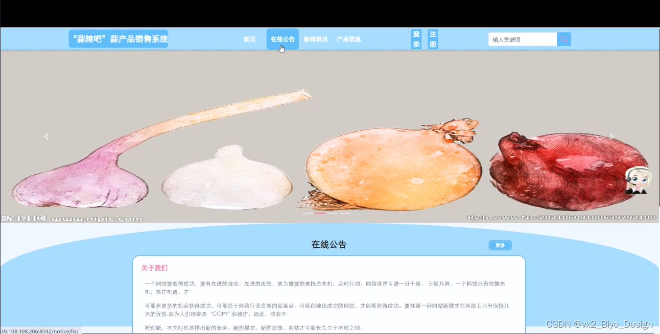 (5)公共管理:管理员可以对“蒜辣吧”蒜产品销售系统 中首页显示的轮播图以及系统中的一些公告发布到系统当中,让用户及时的查看到公告信息,进行合理安排。
