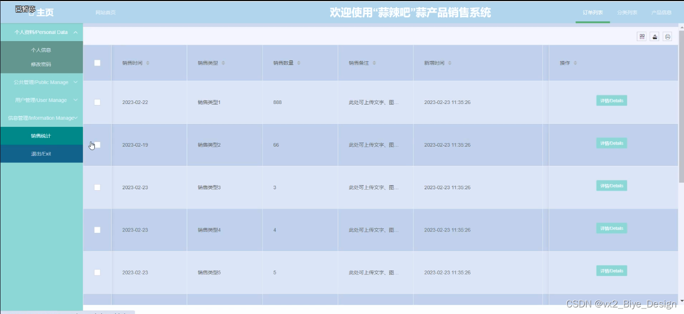 The main functional modules of the "garlic spicy bar" garlic product sales system include personal data, public management, user management, sales statistics, order list, product information, and classification list. The object-oriented development model is adopted for software development and hardware installation, which can well meet the actual use needs, improve the corresponding software installation and program coding, and take MySQL as the main storage unit of background data, Using the ssm framework, Java technology and Ajax technology to code and develop the business system, all the functions of the system are realized. This report first analyzes the background, role and significance of the research, laying a foundation for the rationality of the research work. Based on the analysis of various requirements and technical problems of the garlic product sales system of "Garlic Spicy Bar", the necessity and technical feasibility of the system are proved, and then the technical software and design ideas needed to be used in the design system are introduced. Finally, the "Garlic Spicy Bar" garlic product sales system and its deployment and operation are implemented.