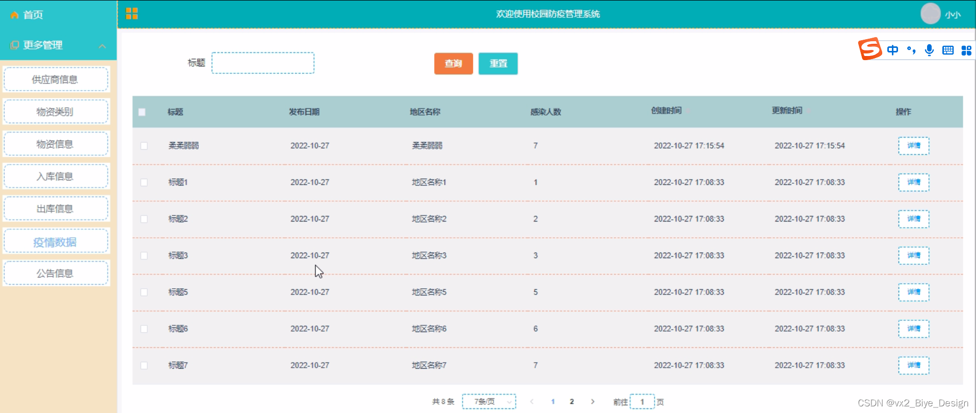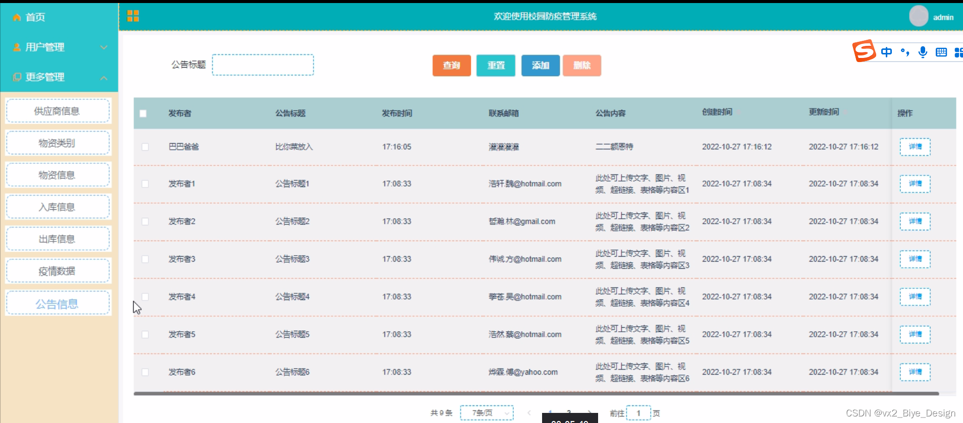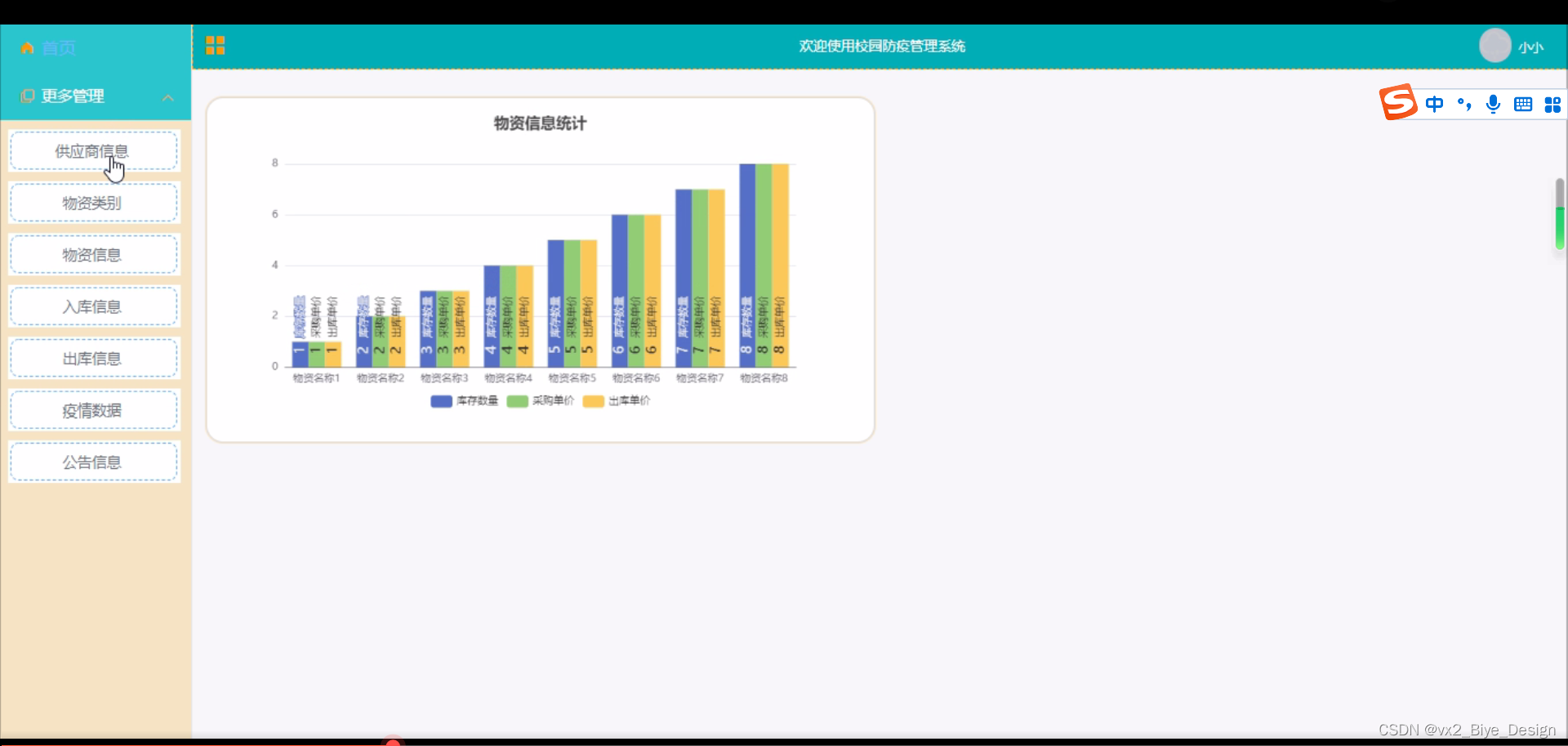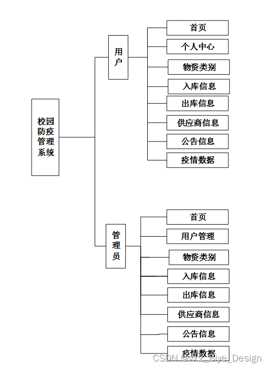 校园防疫管理系统,主要的模块包括查看首页、用户管理(管理员、注册用户)更多管理(供应商信息、物资类别、物资信息、入库信息、出库信息、疫情数据、公告信息)等功能。系统中管理员主要是为了安全有效地存储和管理各类信息,还可以对系统进行管理与更新维护等操作,并且对后台有相应的操作权限。