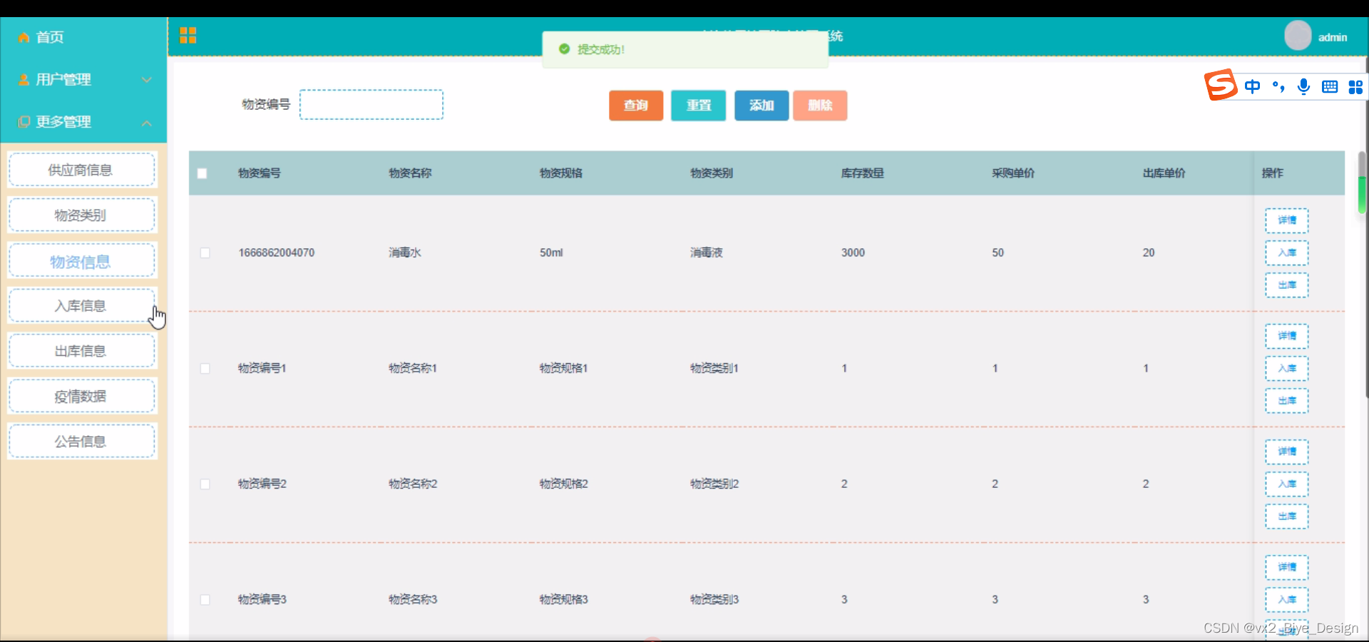 3、功能的完善性:可以管理首页、用户管理(管理员、注册用户)更多管理(供应商信息、物资类别、物资信息、入库信息、出库信息、疫情数据、公告信息)系统管理模块的修改和维护操作。