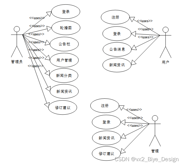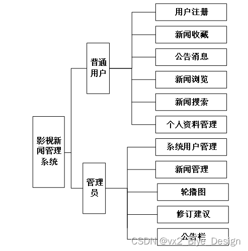 新闻管理系统的功能主要分为前台用户根据自己的需求进行注册登录,浏览新闻信息并对选中的新闻进行搜索操作。后台系统管理员因职责的不同,管理员主要对注册用户,新闻数据,新闻评论进行处理。