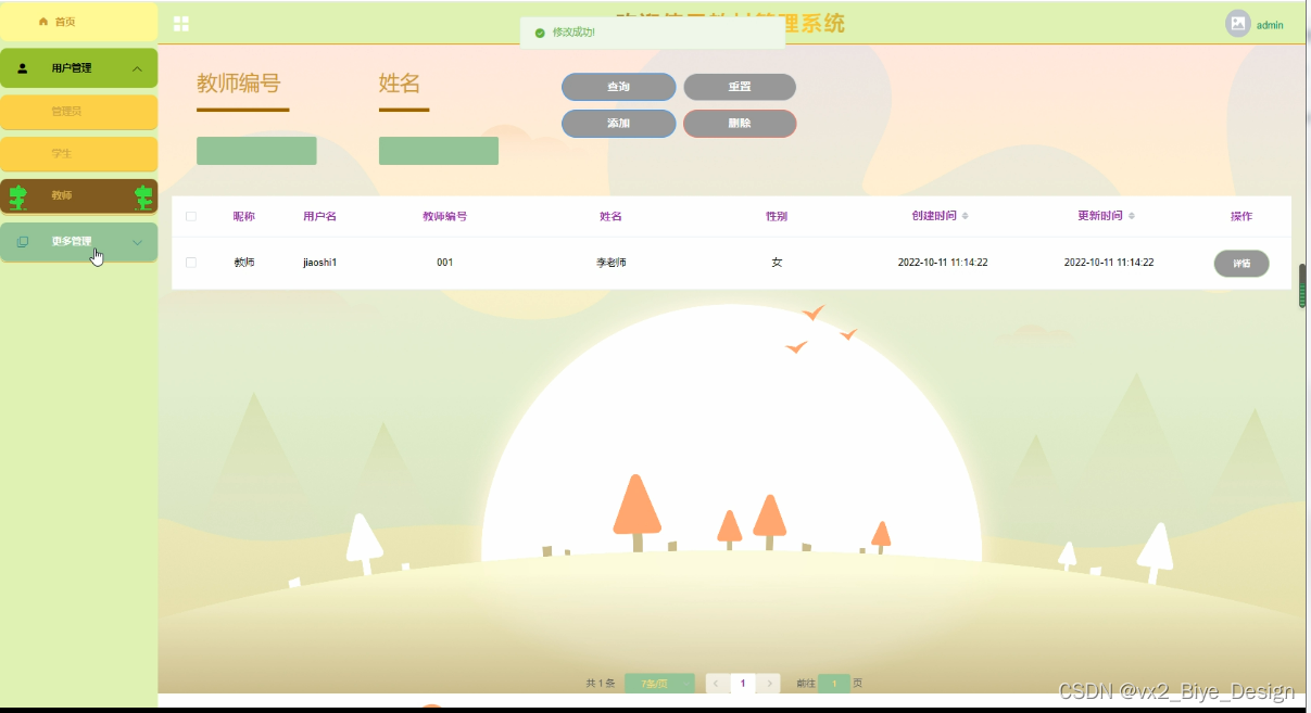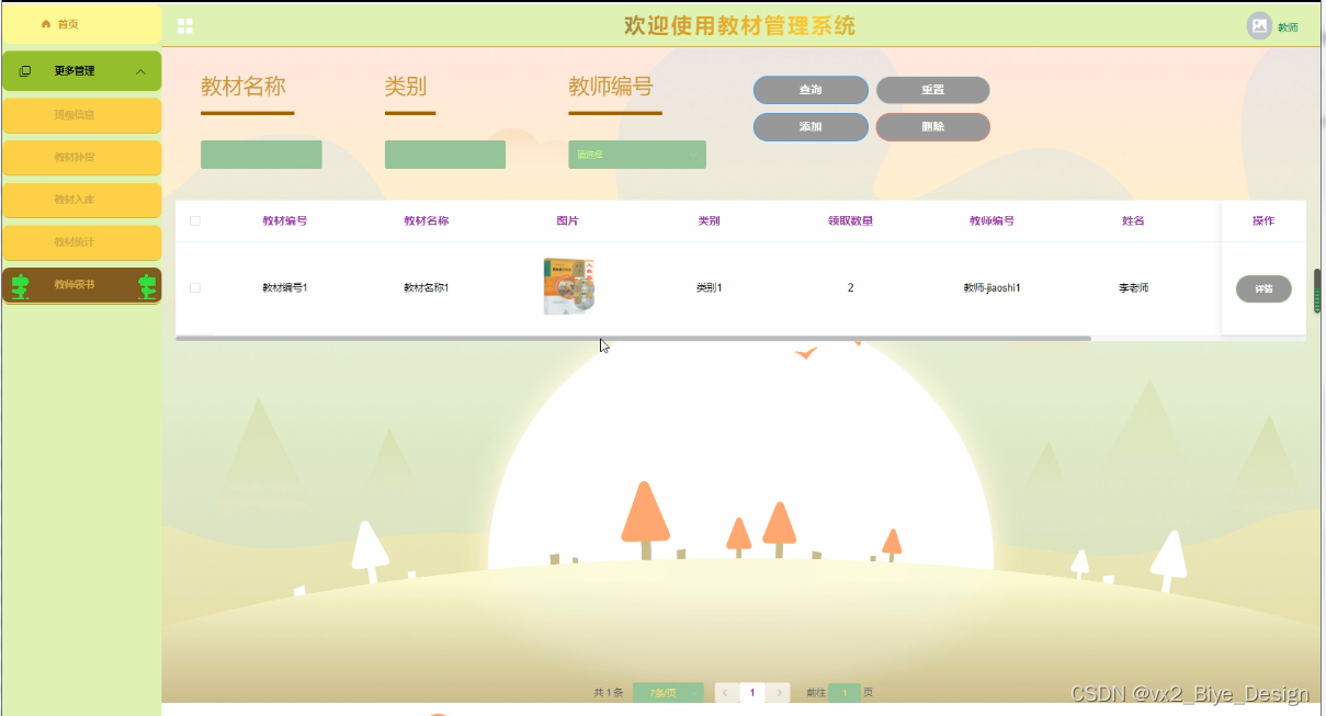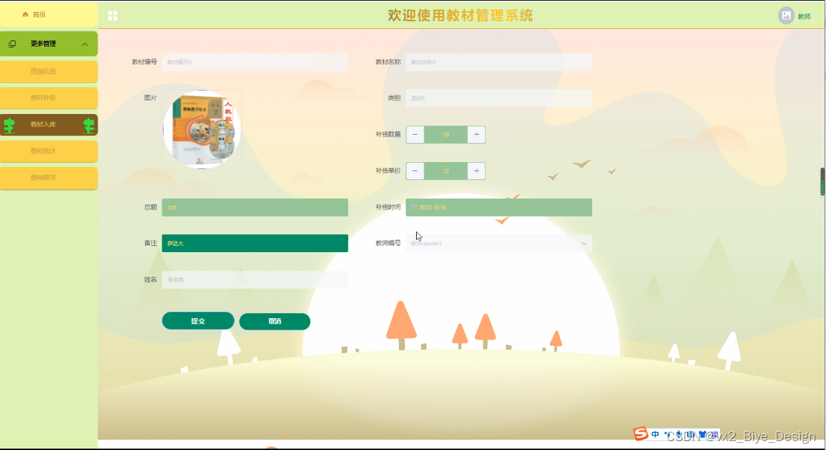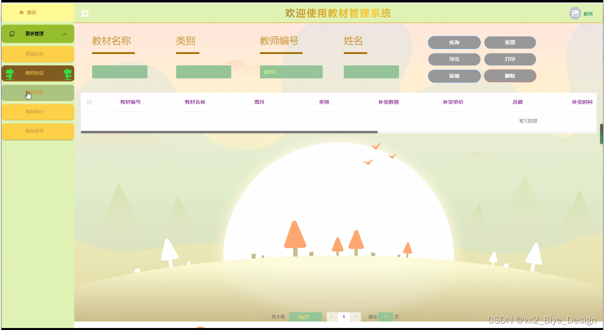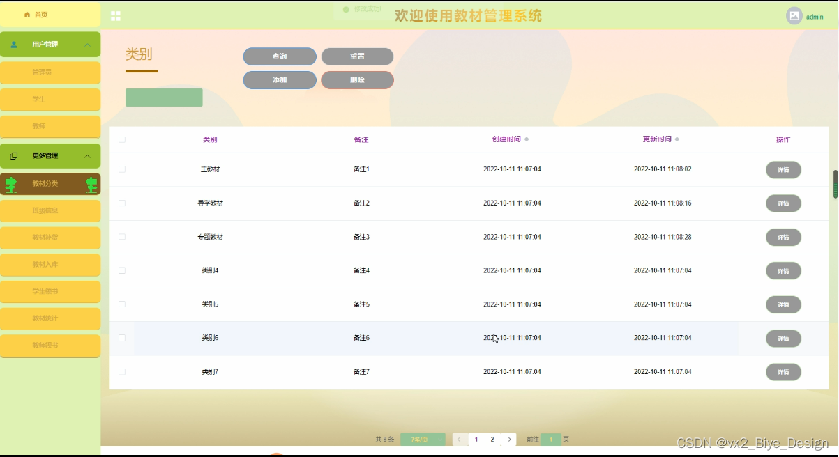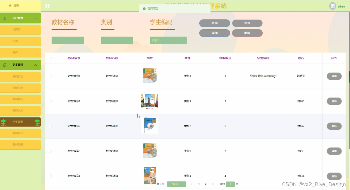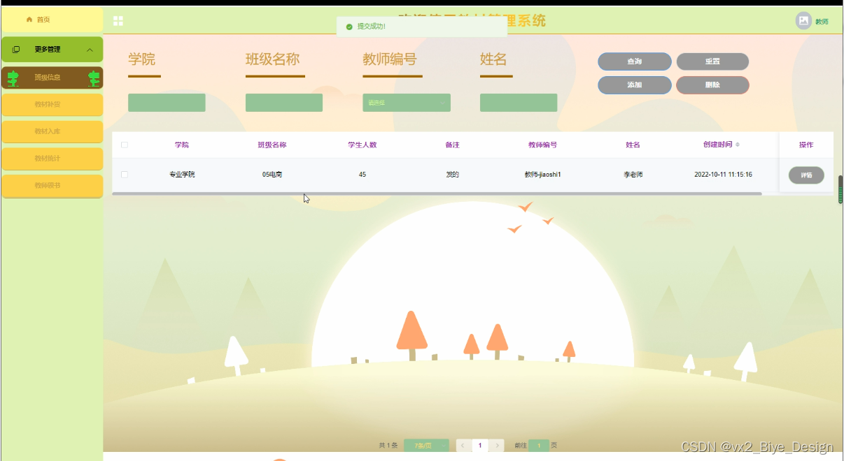 The purpose of developing this teaching material management system is to better manage all kinds of teaching materials of the school, facilitate the operation of teaching material management personnel, the collection of books by students, and the inquiry of teaching material and its inventory. Make the teaching material information management systematic, standardized and automatic, so as to improve the efficiency of teaching material management. Based on the above factors, the following functional modules are mainly designed in this system: students (list of teaching materials, students receiving books); Teachers (class information, textbook replenishment, textbook warehousing, textbook statistics, etc.); Administrator (textbook classification, class information, textbook replenishment, student book collection, textbook statistics, teacher book collection, etc.). It is convenient for everyone to use.