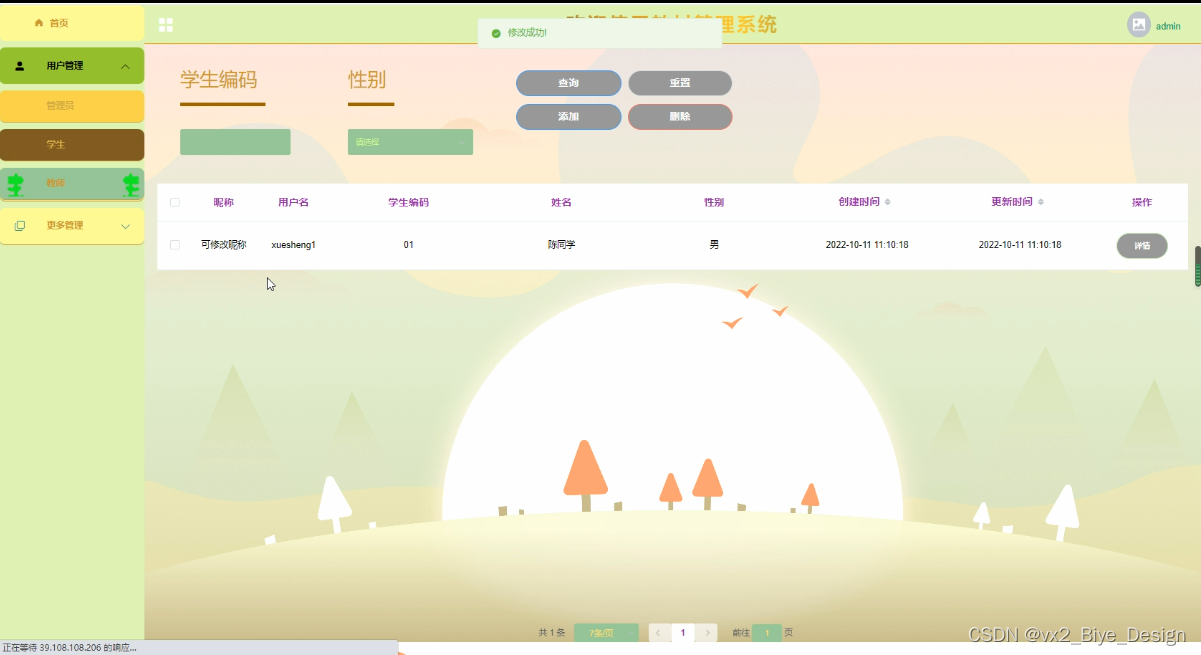 用户管理,在学生管理页面可以对学生信息进行删除,修改等操作,如图5-11所示。